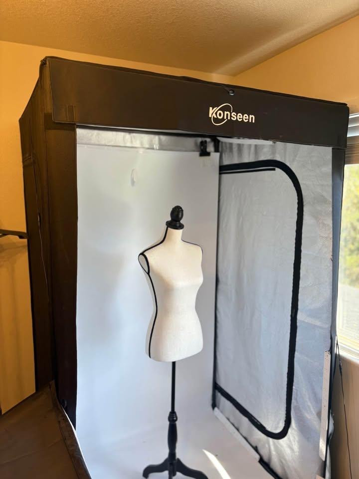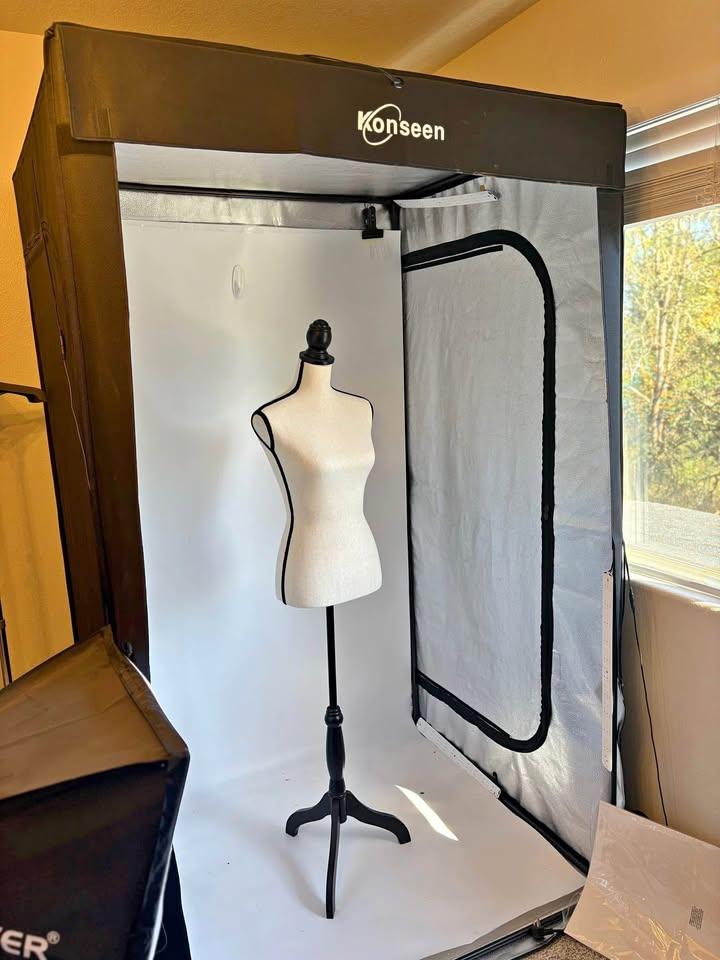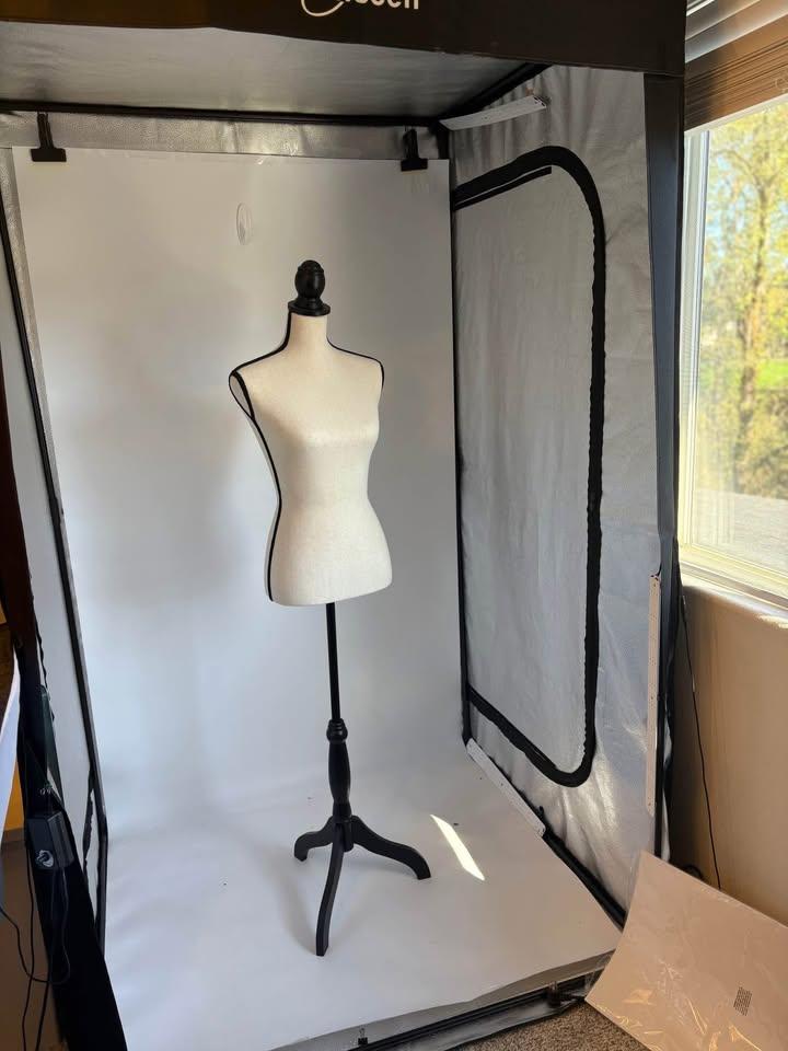 Mannequin not included… Professional Photo Light Box Photography Studio Dimmable LED Large Shooting Tent Cube 47x39x78inch Video Continuous Lighting Lightbox Soft Box with 3 Colors PVC Backdrops and Carrying Bag. The hard part is done for you… putting it together!!!
