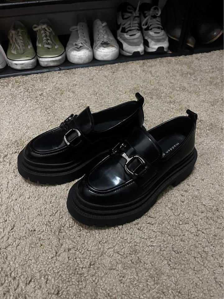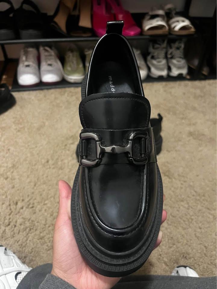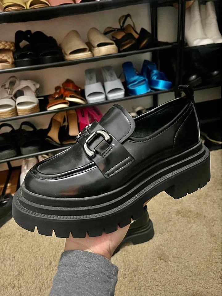 Black platform loafers with black buckle on tops. I think I wore this once? Lol. Getting rid of it because idk how to style this. Really cute! Just ended up not being for me.